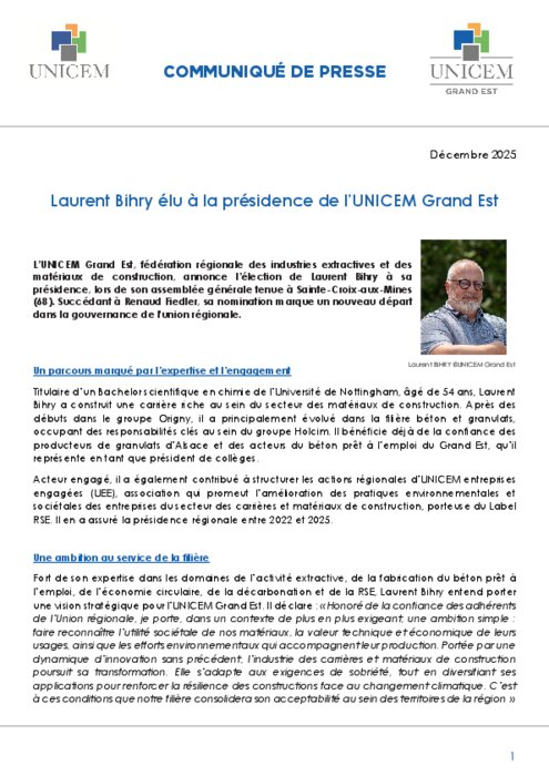 L’UNICEM Grand Est, fédération régionale des industries extractives et des matériaux de construction, annonce l’élection de Laurent Bihry à sa présidence, lors de son assemblée générale tenue à Sainte-Croix-aux-Mines (68). Succédant à Renaud Fiedler, sa nomination marque un nouveau départ dans la gouvernance de l'union régionale.