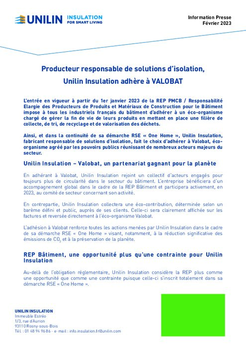 Dans la continuité de sa démarche RSE « One Home », Unilin Insulation, fabricant responsable de solutions d’isolation, fait le choix d’adhérer à Valobat, éco- organisme agréé par les pouvoirs publics réunissant de nombreux acteurs majeurs du secteur.
