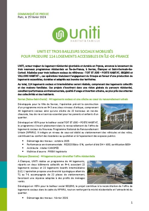 UNITI, acteur majeur du logement résidentiel abordable et durable en France, annonce le lancement de trois nouveaux programmes résidentiels en Île-de-France, à Sevran, Étampes et Saint-Germain-lès-Corbeil. Réalisées pour trois bailleurs sociaux de référence - TOIT ET JOIE – POSTE HABITAT, SEQENS et VALLOIRE HABITAT -, ces opérations traduisent l’engagement du Groupe en faveur d’une production de