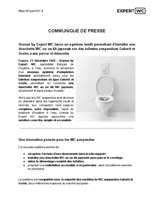 Industriels 02 février 2026 - 14:19 Uranus by Expert WC lance un système inédit permettant d’installer une douchette WC ou un kit japonais sur des toilettes suspendues Geberit et Grohe, sans perçage ni démontage. PDF (211 Ko) Télécharger