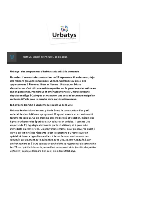 Un collectif en cours de construction de 28 logements à Landerneau, déjà des maisons groupées à Quimper, Vannes, Guérande ou Binic, des appartements à Pluneret, Brest et Nantes : Urbatys, en 30 ans d’expérience, s’est bâti une solide expertise sur le grand ouest et même en région parisienne. Promoteur et aménageur foncier, Urbatys rayonne depuis son siège à Quimper, et maintient une activité soutenue malgré un contexte difficile pour le marché de la construction neuve.