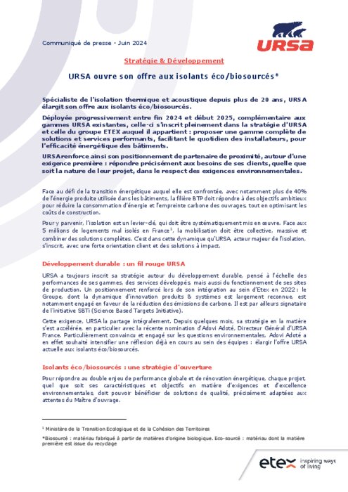 Spécialiste de l’isolation thermique et acoustique depuis plus de 20 ans, URSA élargit son offre aux isolants éco/biosourcés. Déployée progressivement entre fin 2024 et début 2025, complémentaire aux gammes URSA existantes, celle-ci s’inscrit pleinement dans la stratégie d’URSA et celle du groupe ETEX auquel il appartient : proposer une gamme complète de solutions et services performants, facilitant le quotidien des installateurs, pour l’efficacité énergétique des bâtiments.