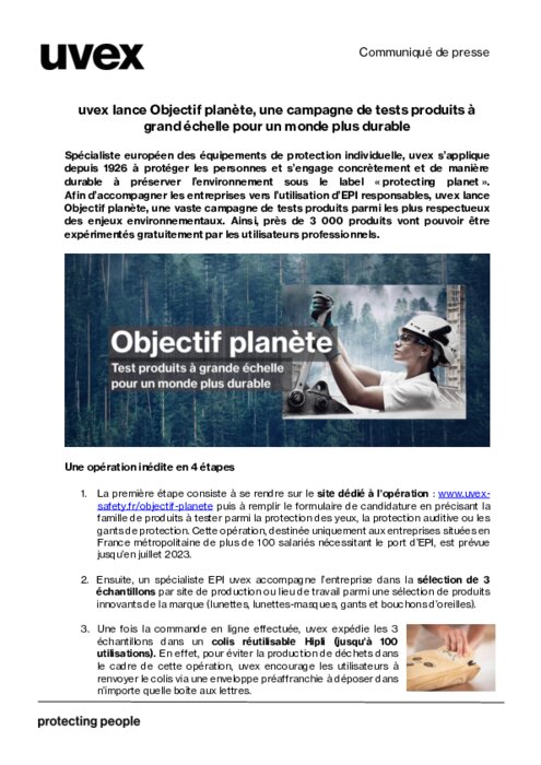 Spécialiste européen des équipements de protection individuelle, uvex s’applique depuis 1926 à protéger les personnes et s’engage concrètement et de manière durable à préserver l’environnement sous le label « protecting planet ». Afin d’accompagner les entreprises vers l’utilisation d’EPI responsables, uvex lance Objectif planète, une vaste campagne de tests produits parmi les plus respectueux des enjeux environnementaux. Ainsi, près de 3 000 produits vont pouvoir être expérimentés gratuitement.