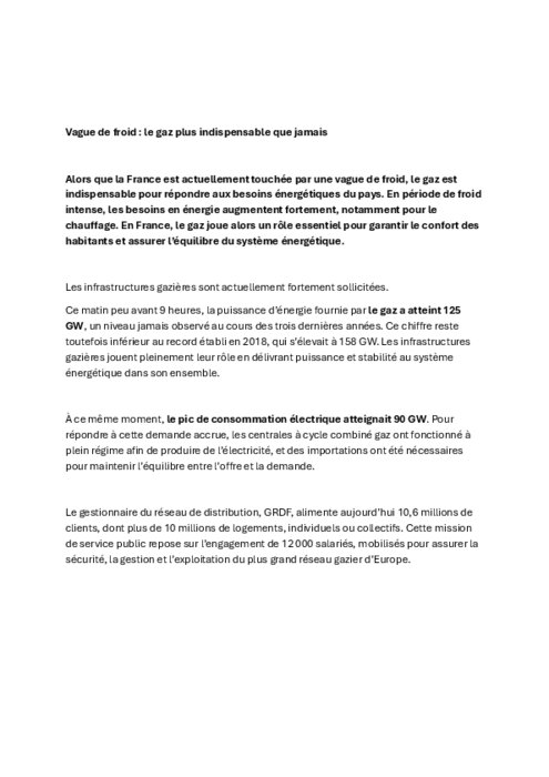 Alors que la France est actuellement touchée par une vague de froid, le gaz est indispensable pour répondre aux besoins énergétiques du pays. En période de froid intense, les besoins en énergie augmentent fortement, notamment pour le chauffage. En France, le gaz joue alors un rôle essentiel pour garantir le confort des habitants et assurer l’équilibre du système énergétique.