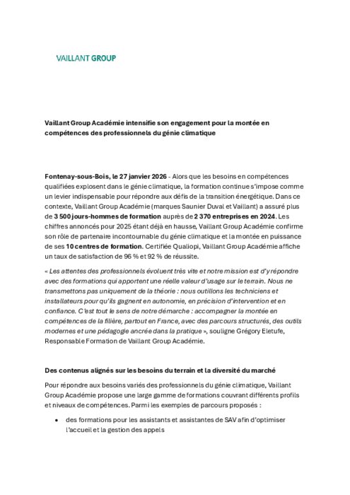 Alors que les besoins en compétences qualifiées explosent dans le génie climatique, la formation continue s’impose comme un levier indispensable pour répondre aux défis de la transition énergétique. Dans ce contexte, Vaillant Group Académie (marques Saunier Duval et Vaillant) a assuré plus de 3 500 jours-hommes de formation auprès de 2 370 entreprises en 2024. Les chiffres annoncés pour 2025 étant déjà en hausse, Vaillant Group Académie confirme son rôle de partenaire incontournable du génie climatique et la montée en puissance de ses 10 centres de formation. Certifiée Qualiopi, Vaillant Group Académie affiche un taux de satisfaction de 96 % et 92 % de réussite.