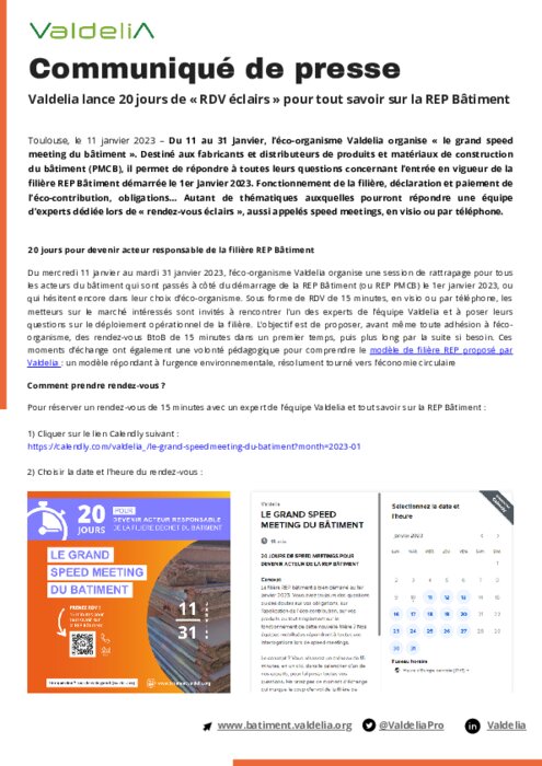 Du 11 au 31 janvier, l’éco-organisme Valdelia organise « le grand speed meeting du bâtiment ». Destiné aux fabricants et distributeurs de produits et matériaux de construction du bâtiment (PMCB), il permet de répondre à toutes leurs questions concernant l’entrée en vigueur de la filière REP Bâtiment démarrée le 1er janvier 2023.
