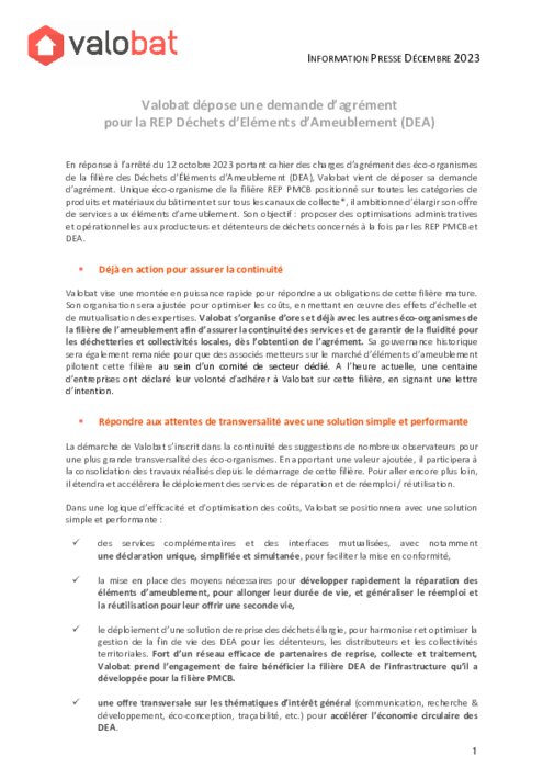En réponse à l’arrêté du 12 octobre 2023 portant cahier des charges d’agrément des éco-organismes de la filière des Déchets d’Éléments d’Ameublement (DEA), Valobat vient de déposer sa demande d’agrément. Unique éco-organisme de la filière REP PMCB positionné sur toutes les catégories de produits et matériaux du bâtiment et sur tous les canaux de collecte, il ambitionne d’élargir son offre de services aux éléments d’ameublement.