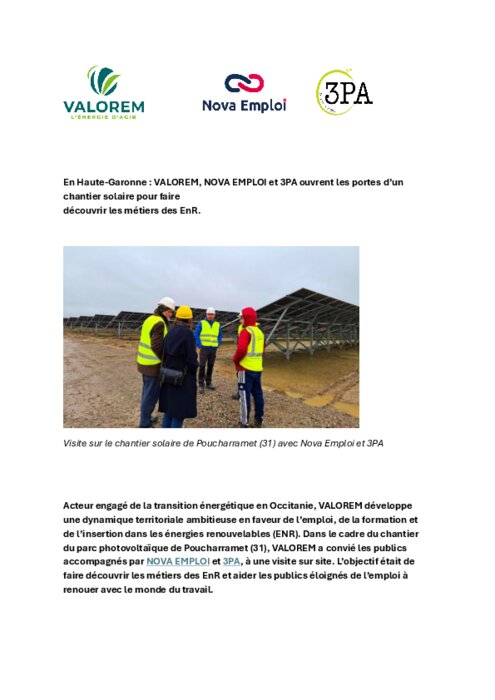 Acteur engagé de la transition énergétique en Occitanie, VALOREM développe une dynamique territoriale ambitieuse en faveur de l’emploi, de la formation et de l’insertion dans les énergies renouvelables (ENR). Dans le cadre du chantier du parc photovoltaïque de Poucharramet (31), VALOREM a convié les publics accompagnés par NOVA EMPLOI et 3PA, à une visite sur site. L’objectif était de faire découvrir les métiers des EnR et aider les publics éloignés de l’emploi à renouer avec le monde du travail.