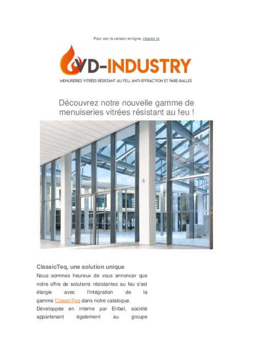 Développée en interne par Eribel, société appartenant également au groupe Haerens, ClassicTeq est unique en son genre. Ce modèle de menuiseries vitrées coupe-feu est composé d'une ossature rigide en acier, d'une isolation thermique et permet de relever les défis esthétiques les plus fous grâce aux finitions aluminium ou inox proposées.