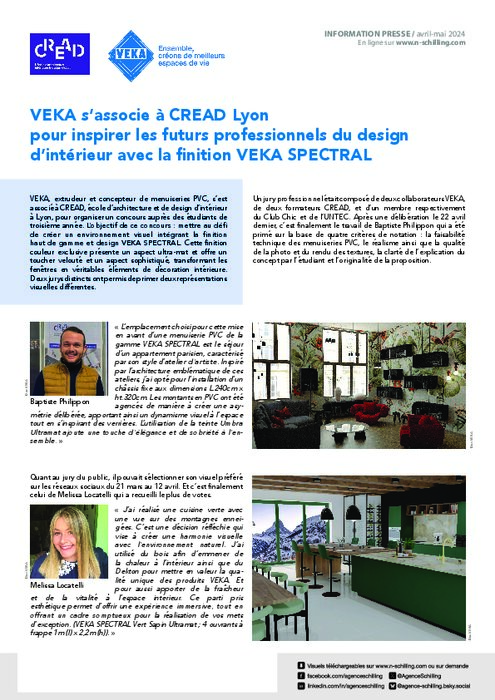 VEKA, extrudeur et concepteur de menuiseries PVC, s’est associé à CREAD, école d’architecture et de design d’intérieur à Lyon, pour organiser un concours auprès des étudiants de troisième année. L’objectif de ce concours : mettre au défi de créer un environnement visuel intégrant la finition haut de gamme et design VEKA SPECTRAL. Cette finition couleur exclusive présente un aspect ultra-mat et offre un toucher velouté et un aspect sophistiqué, transformant les fenêtres en véritables éléments de décoration intérieure.