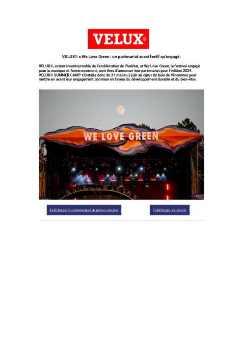Velux, acteur incontournable de l'amélioration de l'habitat, et We Love Green, le festival engagé pour la musique et l'environnement, sont fiers d'annoncer leur partenariat pour l'édition 2024. VELUX SUMMER CAMP s'installe donc du 31 mai au 2 juin au cœur du bois de Vincennes pour mettre en avant leur engagement commun en faveur du développement durable et du bien-être.