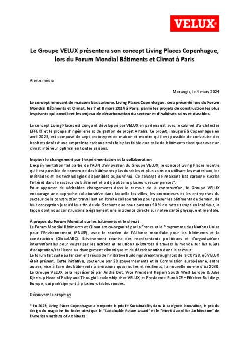 Le concept innovant de maisons bas carbone, Living Places Copenhague, sera présenté lors du Forum Mondial Bâtiments et Climat, les 7 et 8 mars 2024 à Paris, parmi les projets de construction les plus inspirants qui concilient les enjeux de décarbonation du secteur et d’habitats sains et durables.