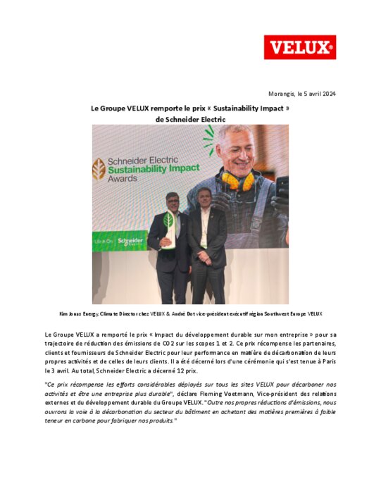 VELUX remporte le prix "Sustainability Impact" de Schneider Electric