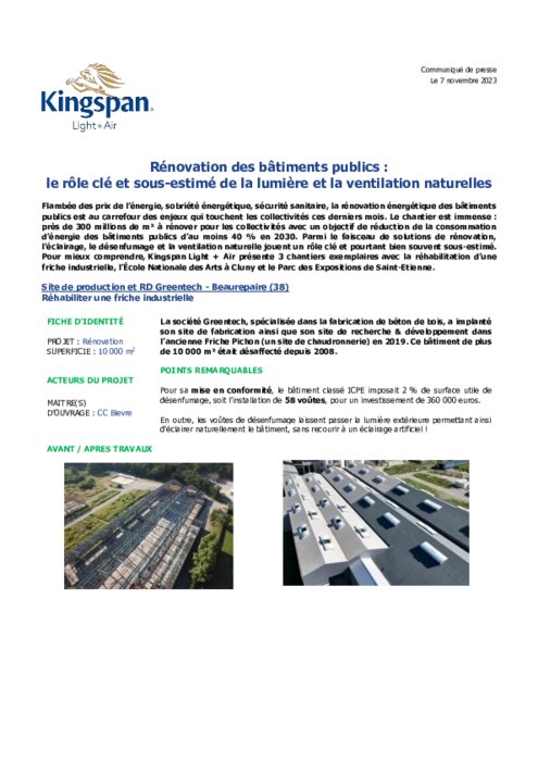 Industriels 07 novembre 2023 - 12:12 Kingspan Light + Air présente 3 chantiers exemplaires avec la réhabilitation d’une friche industrielle, l’École Nationale des Arts à Cluny et le Parc des Expositions de Saint-Etienne. PDF (332 Ko) Télécharger