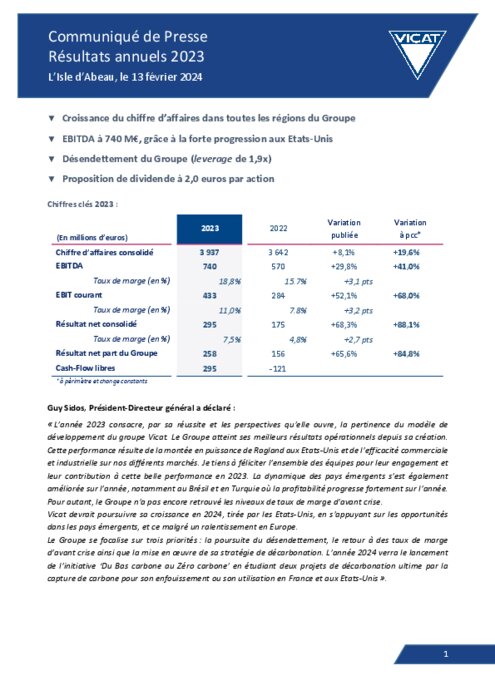 Voici les points forts sur 2023 : Croissance du chiffre d’affaires dans toutes les régions du Groupe ; EBITDA à 740 M€, grâce à la forte progression aux Etats-Unis ; Désendettement du Groupe (leverage de 1,9x) ; Proposition de dividende à 2,0 euros par action.