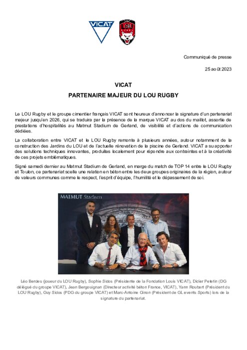 Le LOU Rugby et le groupe cimentier français VICAT sont heureux d’annoncer la signature d’un partenariat majeur jusqu’en 2026, qui se traduira par la présence de la marque VICAT au dos du maillot, assortie de prestations d’hospitalités au Matmut Stadium de Gerland, de visibilité et d’actions de communication dédiées.