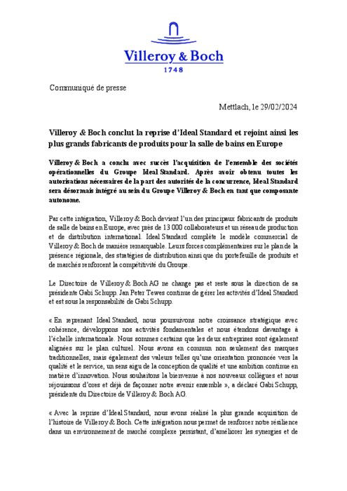 Villeroy & Boch a conclu avec succès l’acquisition de l’ensemble des sociétés opérationnelles du groupe Ideal Standard. Après avoir obtenu toutes les autorisations nécessaires de la part des autorités de la concurrence, Ideal Standard sera désormais intégré au sein du groupe Villeroy & Boch en tant que composante autonome.