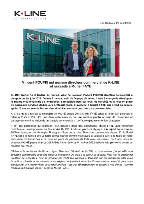 K•LINE, leader de la fenêtre en France, vient de nommer Vincent POUPIN directeur commercial à compter du 1er juin 2023. Depuis 21 ans au sein de l’équipe de vente, il aura à charge de développer la stratégie commerciale de l’entreprise, son déploiement sur tous les marchés et la mise en place de nouveaux services dédiés aux professionnels. Il succède à Muriel FAYE qui prend sa retraite après 15 ans au sein de l'entreprise, dont 9 ans en tant que directrice commerciale.