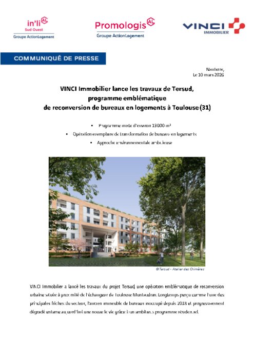 VINCI Immobilier a lancé les travaux du projet Tersud, une opération emblématique de reconversion urbaine située à proximité de l’échangeur de Toulouse Montaudran. Longtemps perçu comme l’une des principales friches du secteur, l’ancien immeuble de bureaux inoccupé depuis 2018 et progressivement dégradé entame aujourd’hui une nouvelle vie grâce à un ambitieux programme résidentiel.