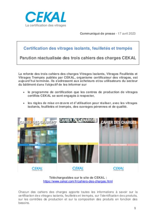 La refonte des trois cahiers des charges Vitrages Isolants, Vitrages Feuilletés et Vitrages Trempés publiés par CEKAL, organisme certificateur des vitrages, est aujourd’hui terminée. Ils s'adressent aux acheteurs et/ou utilisateurs du secteur du bâtiment dans l’objectif de les informer.