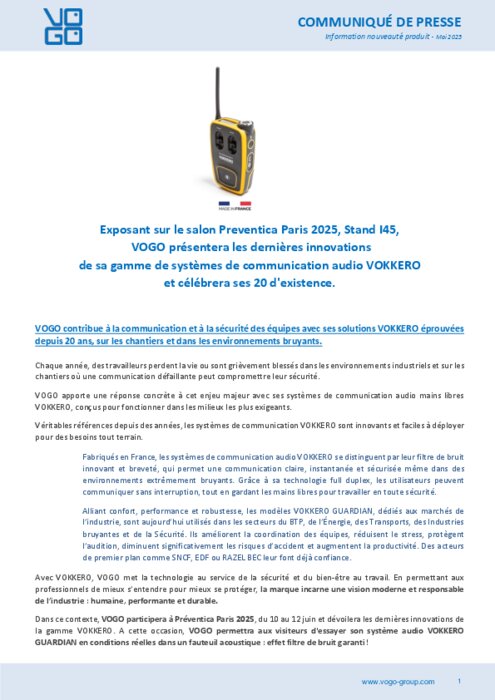 Fabriqués en France, les systèmes de communication audio Vokkero se distinguent par leur filtre de bruit innovant et breveté, qui permet une communication claire, instantanée et sécurisée même dans des environnements extrêmement bruyants. Grâce à sa technologie full duplex, les utilisateurs peuvent communiquer sans interruption, tout en gardant les mains libres pour travailler en toute sécurité.