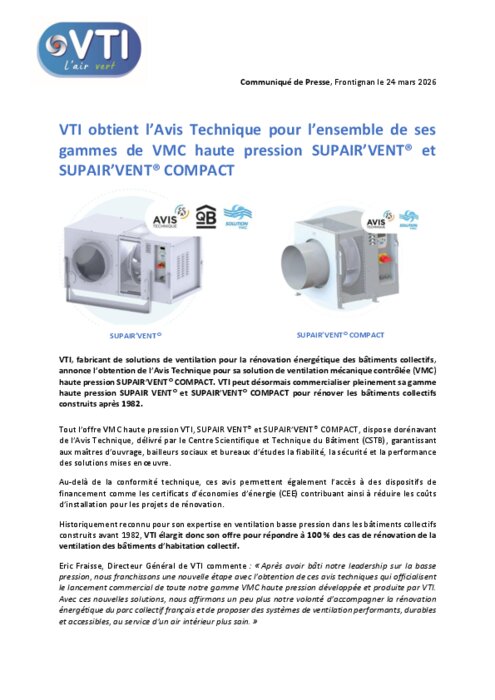 VTI, fabricant de solutions de ventilation pour la rénovation énergétique des bâtiments collectifs, annonce l’obtention de l’Avis Technique pour sa solution de ventilation mécanique contrôlée (VMC) haute pression SUPAIR’VENT COMPACT. VTI peut désormais commercialiser pleinement sa gamme haute pression SUPAIR VENT® et SUPAIR’VENT COMPACT pour rénover les bâtiments collectifs construits après 1982.