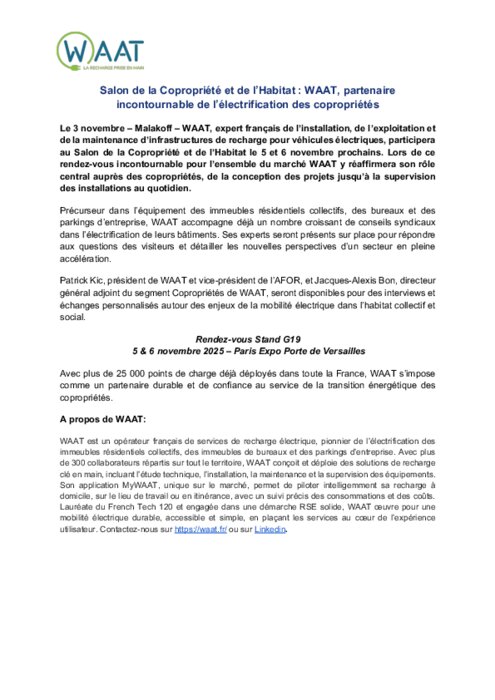 WAAT, expert français de l’installation, de l’exploitation et de la maintenance d’infrastructures de recharge pour véhicules électriques, participera au Salon de la Copropriété et de l’Habitat le 5 et 6 novembre prochains. Lors de ce rendez-vous incontournable pour l’ensemble du marché WAAT y réaffirmera son rôle central auprès des copropriétés, de la conception des projets jusqu’à la supervision des installations au quotidien.