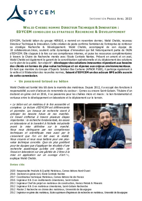 Walid Chebbi, accompagné de son équipe de 18 collaborateurs.trices, soutient cette dynamique d’innovation qui fait historiquement partie de l’ADN d’EDYCEM. Elle s’appuie à la fois sur ses compétences internes, et puise les ressources complémentaires à travers la Chaire de Recherche menée avec l’école Centrale Nantes. Présent en amont et en aval, Walid Chebbi est également le garant de la concrétisation opérationnelle et du déploiement des solutions sur le plan de la qualité.