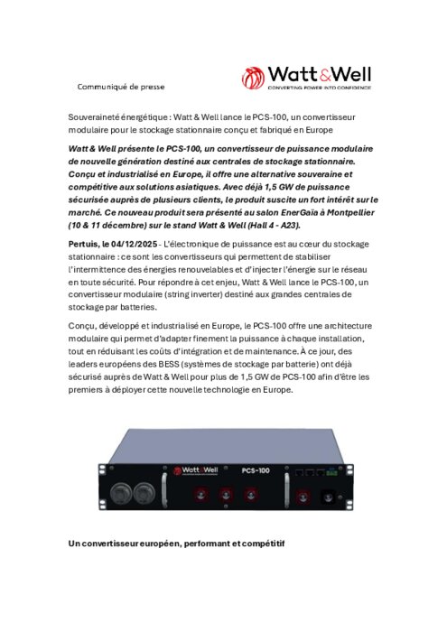 Watt & Well présente le PCS-100, un convertisseur de puissance modulaire de nouvelle génération destiné aux centrales de stockage stationnaire. Conçu et industrialisé en Europe, il offre une alternative souveraine et compétitive aux solutions asiatiques. Avec déjà 1,5 GW de puissance sécurisée auprès de plusieurs clients, le produit suscite un fort intérêt sur le marché. Ce nouveau produit sera présenté au salon EnerGaïa à Montpellier (10 & 11 décembre) sur le stand Watt & Well (Hall 4 - A23).