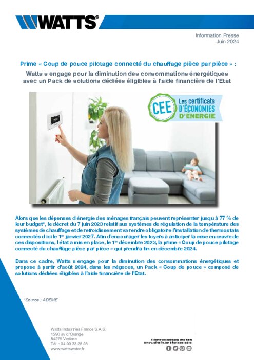 Watts s’engage pour la diminution des consommations énergétiques et propose à partir d’août 2024, dans les négoces, un Pack « Coup de pouce » composé de solutions dédiées éligibles à l’aide financière de l’Etat.