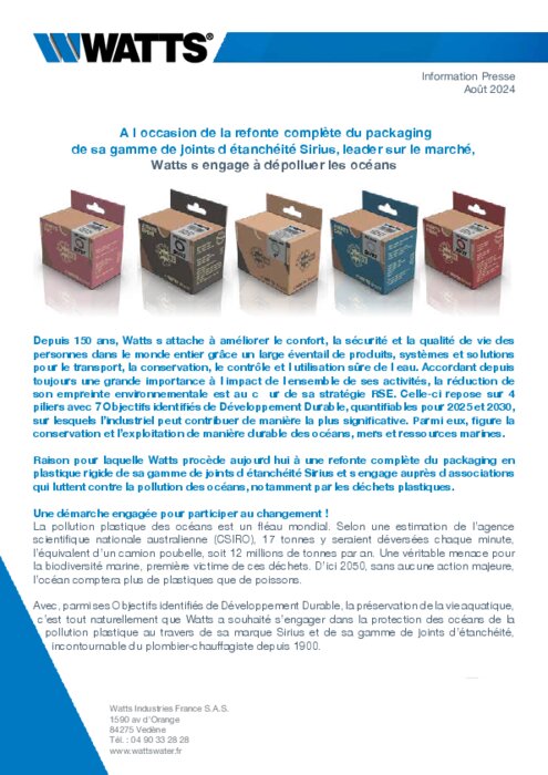 Industriels 30 août 2024 - 16:11 Watts procède aujourd’hui à une refonte complète du packaging en plastique rigide de sa gamme de joints d’étanchéité Sirius et s’engage auprès d’associations qui luttent contre la pollution des océans, notamment par les déchets plastiques. PDF (296 Ko) Télécharger