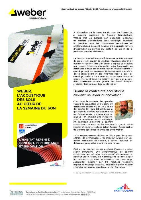 Le bruit est aujourd’hui identifié comme un enjeu majeur de santé et de qualité de vie. Dans l’habitat collectif, les nuisances sonores liées aux bruits d’impact constituent une source fréquente d’inconfort entre logements, en particulier lorsque des revêtements de sol durs, comme le carrelage, sont mis en œuvre. Historiquement spécialiste des mortiers-colles et des systèmes pour la pose de carrelage, Weber a vu le sujet de l’acoustique s’imposer progressivement dans ses métiers, dès lors que la pose d’un revêtement carrelé génère des bruits d’impact (solidiens)transmis aux logements voisins.