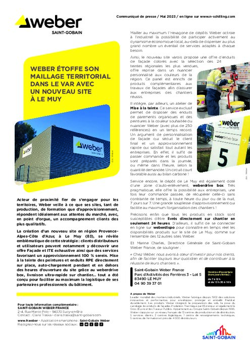 Acteur de proximité fier de s’engager pour les territoires, Weber veille à ce que ses sites, tant de production, de formation que d’approvisionnement, répondent idéalement aux attentes du marché, avec, en point d’orgue, un accompagnement clients des plus qualitatifs. La création d’un nouveau site en région Provence-Alpes-Côte d'Azur, au Muy, se révèle emblématique de cette stratégie.