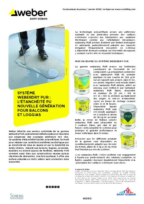 Weber dévoile une version optimisée de sa gamme weberdry PUR, spécialement développée pour répondre aux exigences des ouvrages extérieurs non clos. Ce système d’étanchéité liquide polyuréthane, formulé pour résister aux conditions extrêmes se distingue par sa simplicité de mise en œuvre et par la durabilité du rendu obtenu. Adapté aux balcons, loggias, coursives, escaliers ou encore appuis de fenêtres, weberdy PUR convient aussi bien aux constructions neuves qu’aux chantiers de rénovation. Une fois appliqué, il offre une surface adaptée au trafic piéton sans protection dure rapportée.