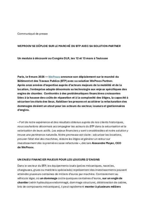 WeProov annonce son déploiement sur le marché du Bâtiment et des Travaux Publics (BTP) avec sa solution WeProov Partner. Après onze années d’expertise auprès d’acteurs majeurs de la mobilité et de la location, l’entreprise adapte désormais sa technologie aux enjeux spécifiques des engins de chantier. Confrontés à des problématiques financières croissantes liées à la hausse des coûts de réparation et à la complexité des litiges, la capacité à sécuriser les états des lieux, fiabiliser les preuves et accélérer la refacturation des dommages devient un atout pour les acteurs du secteur, loueurs et gestionnaires d’engins.