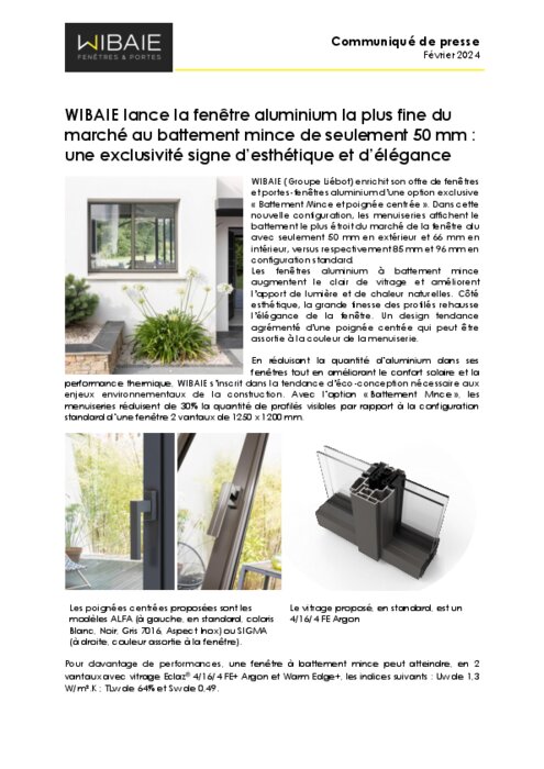 WIBAIE (Groupe Liébot) enrichit son offre de fenêtres et portes-fenêtres aluminium d’une option exclusive « Battement Mince et poignée centrée ». Dans cette nouvelle configuration, les menuiseries affichent le battement le plus étroit du marché de la fenêtre alu avec seulement 50 mm en extérieur et 66 mm en intérieur, versus respectivement 85 mm et 96 mm en configuration standard.