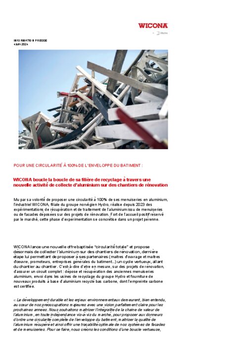 WICONA lance une nouvelle offre baptisée “circularité́ totale” et propose désormais de collecter l’aluminium sur des chantiers de rénovation, dernière étape lui permettant de proposer à ses partenaires (maitres d'ouvrage et maitres