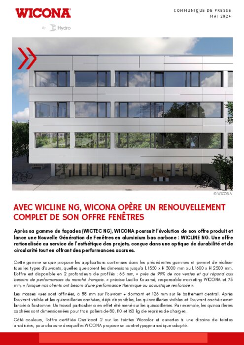 Après sa gamme de façades (Wictec NG), Wicona poursuit l’évolution de son offre produit et lance une Nouvelle Génération de Fenêtres en aluminium bas carbone : Wicline NG. Une offre rationalisée au service de l’esthétique des projets, conçue dans une optique de durabilité et de circularité tout en offrant des performances accrues.