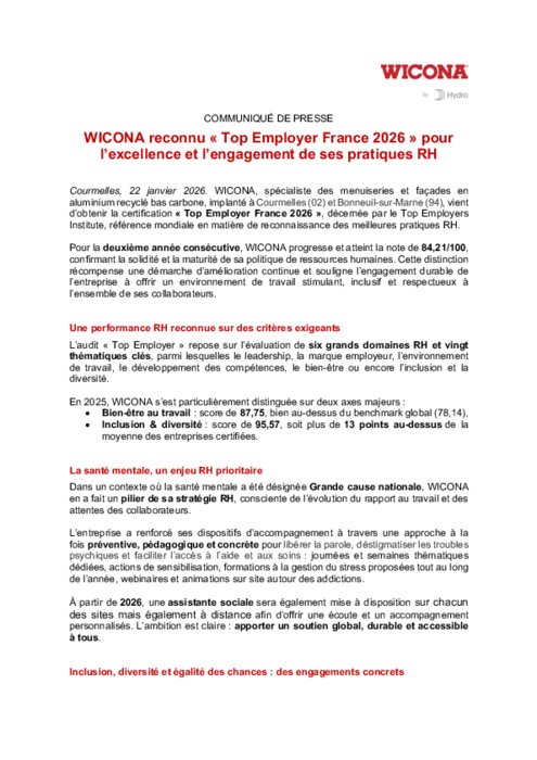 Cette distinction vient saluer l’engagement de WICONA en faveur de la qualité de vie au travail, du développement des compétences et de l’attractivité des métiers industriels.