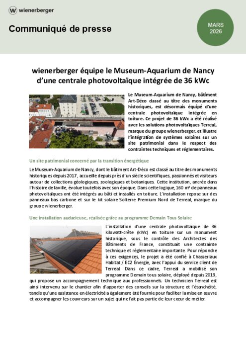Le Museum-Aquarium de Nancy, bâtiment Art-Déco classé au titre des monuments historiques, est désormais équipé d’une centrale photovoltaïque intégrée en toiture. Ce projet de 36 kWc a été réalisé avec les solutions photovoltaïques Terreal, marque du groupe wienerberger, et illustre l’intégration de systèmes solaires sur un site patrimonial dans le respect des contraintes techniques et réglementaires.