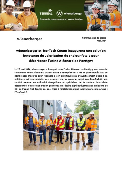 Le 29 mai 2024, wienerberger a inauguré dans l’usine Aléonard de Pontigny une nouvelle solution de valorisation de la chaleur fatale. L’entreprise qui a mis en place depuis 2021 de nombreuses mesures pour répondre à son ambitieux plan d’investissement dédié à sa politique environnementale, s’est associée pour ce nouveau projet avec Eco-Tech Ceram, société experte en efficacité énergétique et spécialiste de la chaleur industrielle décarbonée.