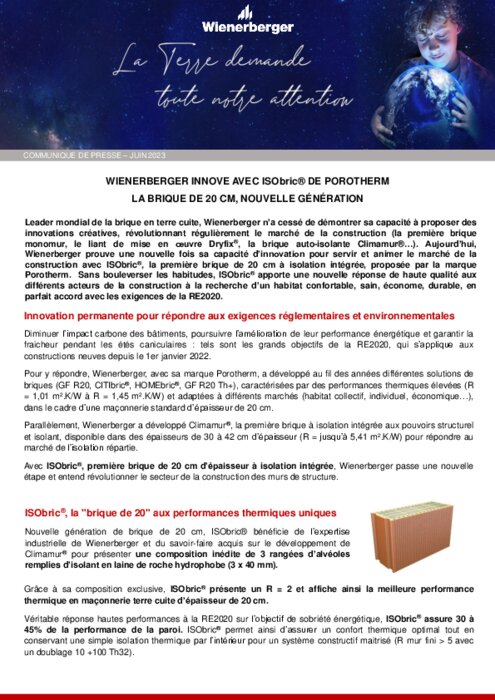 Wienerberger prouve une nouvelle fois sa capacité d’innovation pour servir et animer le marché de la construction avec ISObric, la première brique de 20 cm à isolation intégrée, proposée par la marque Porotherm. Sans bouleverser les habitudes, ISObric apporte une nouvelle réponse de haute qualité aux différents acteurs de la construction à la recherche d’un habitat confortable, sain, économe, durable, en parfait accord avec les exigences de la RE2020.
