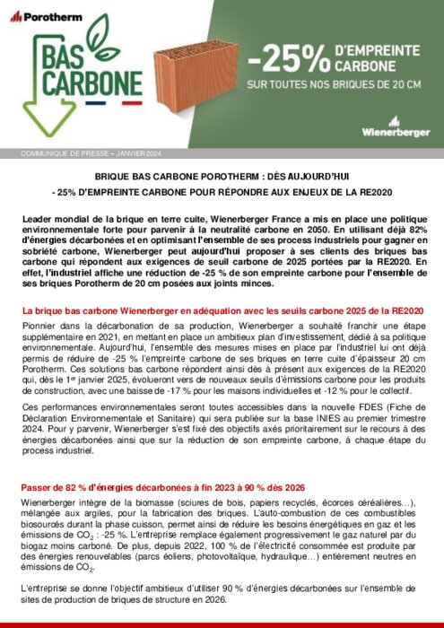 sobriété carbone, Wienerberger peut aujourd’hui proposer à ses clients des briques bas carbone qui répondent aux exigences de seuil carbone de 2025 portées par la RE2020.