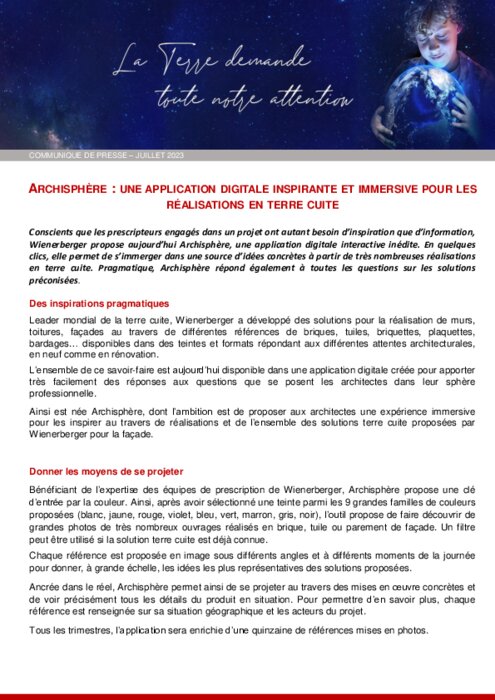 Conscients que les prescripteurs engagés dans un projet ont autant besoin d’inspiration que d’information, Wienerberger propose aujourd’hui Archisphère, une application digitale interactive inédite. En quelques clics, elle permet de s’immerger dans une source d’idées concrètes à partir de très nombreuses réalisations en terre cuite. Pragmatique, Archisphère répond également à toutes les questions sur les solutions préconisées.