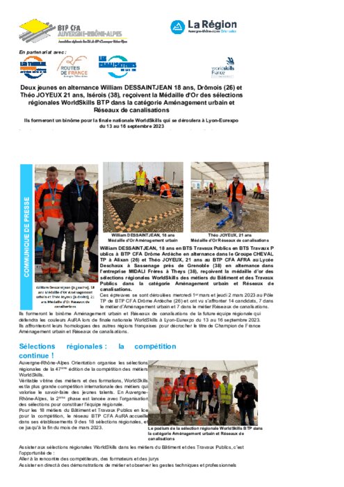 Institutionnels 03 mars 2023 - 13:19 Ils formeront un binôme pour la finale nationale WorldSkills qui se déroulera à Lyon-Eurexpo du 13 au 16 septembre 2023. PDF (553 Ko) Télécharger
