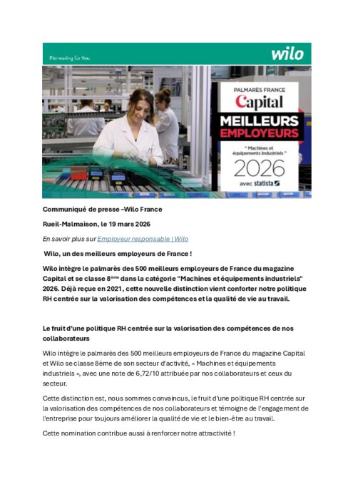 Wilo intègre le palmarès des 500 meilleurs employeurs de France du magazine Capital et se classe 8ᵉ dans la catégorie "Machines et équipements industriels" 2026. Déjà reçue en 2021, cette nouvelle distinction vient conforter une politique RH centrée sur la valorisation des compétences et la qualité de vie au travail.