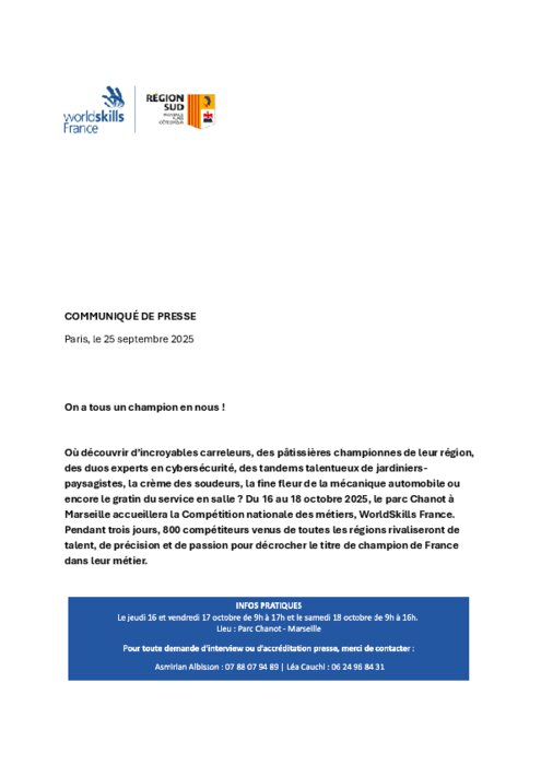Où découvrir d’incroyables carreleurs, des pâtissières championnes de leur région, des duos experts en cybersécurité, des tandems talentueux de jardiniers-paysagistes, la crème des soudeurs, la fine fleur de la mécanique automobile ou encore le gratin du service en salle ? Du 16 au 18 octobre 2025, le parc Chanot à Marseille accueillera la Compétition nationale des métiers, WorldSkills France. Pendant trois jours, 800 compétiteurs venus de toutes les régions rivaliseront de talent, de précision et de passion pour décrocher le titre de champion de France dans leur métier.