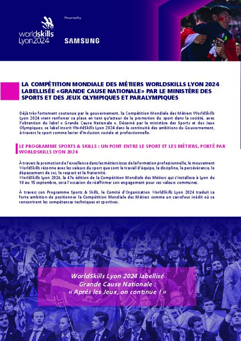 Déjà très fortement soutenue par le gouvernement, la Compétition Mondiale des Métiers WorldSkills Lyon 2024 vient renforcer sa place en tant qu’acteur de la promotion du sport dans la société, avec l’obtention du label « Grande Cause Nationale ». Décerné par le ministère des Sports et des Jeux Olympiques, ce label inscrit WorldSkills Lyon 2024 dans la continuité des ambitions du Gouvernement, à travers le sport comme levier d’inclusion sociale et professionnelle.