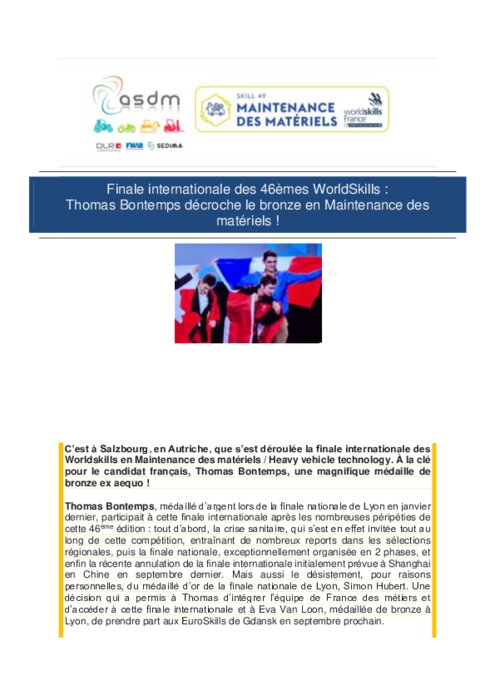 Institutionnels 28 novembre 2022 - 09:46 C’est à Salzbourg, en Autriche, que s’est déroulée la finale internationale des Worldskills en Maintenance des matériels / Heavy vehicle technology. À la clé pour le candidat français, Thomas Bontemps, une magnifique médaille de bronze ex aequo. PDF (175 Ko) Télécharger