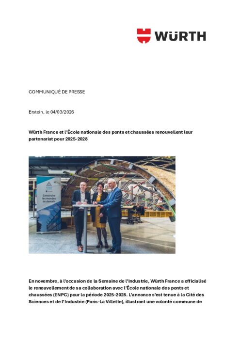 En novembre, à l’occasion de la Semaine de l’Industrie, Würth France a officialisé le renouvellement de sa collaboration avec l’École nationale des ponts et chaussées (ENPC) pour la période 2025-2028. L’annonce s’est tenue à la Cité des Sciences et de l’Industrie (Paris-La Villette), illustrant une volonté commune de renforcer les liens entre l’entreprise et les grandes écoles d’ingénieurs au service de la formation technique.
